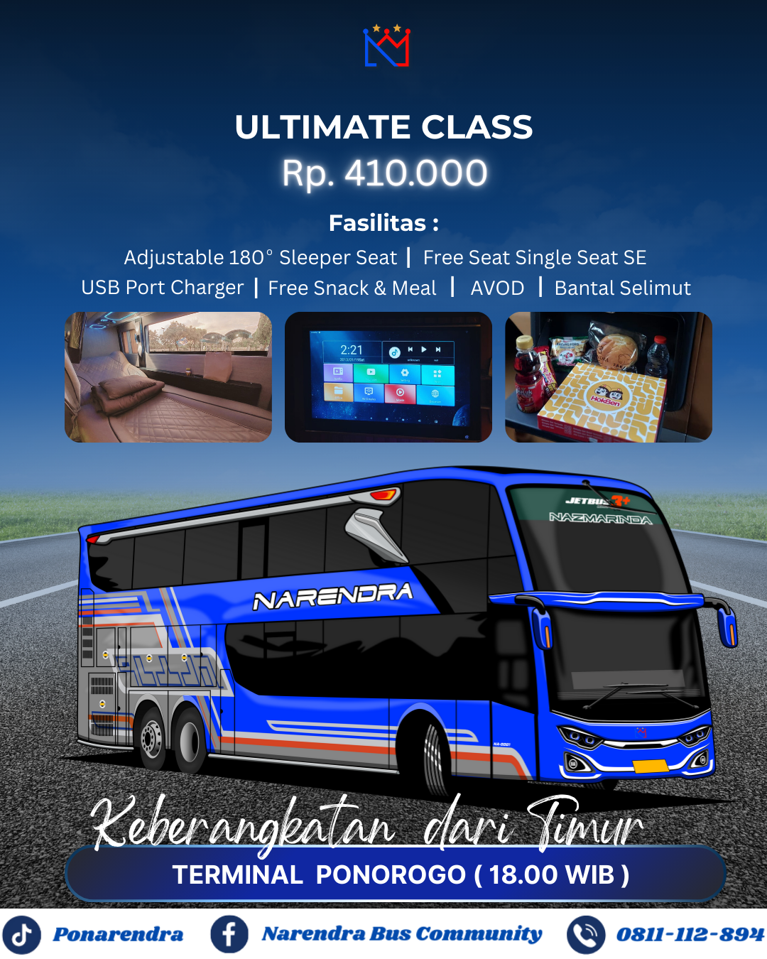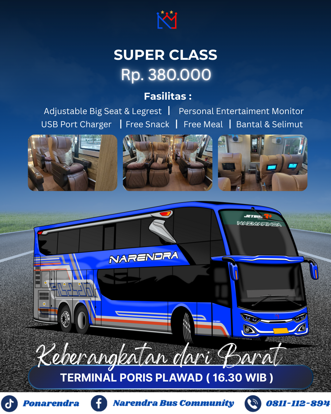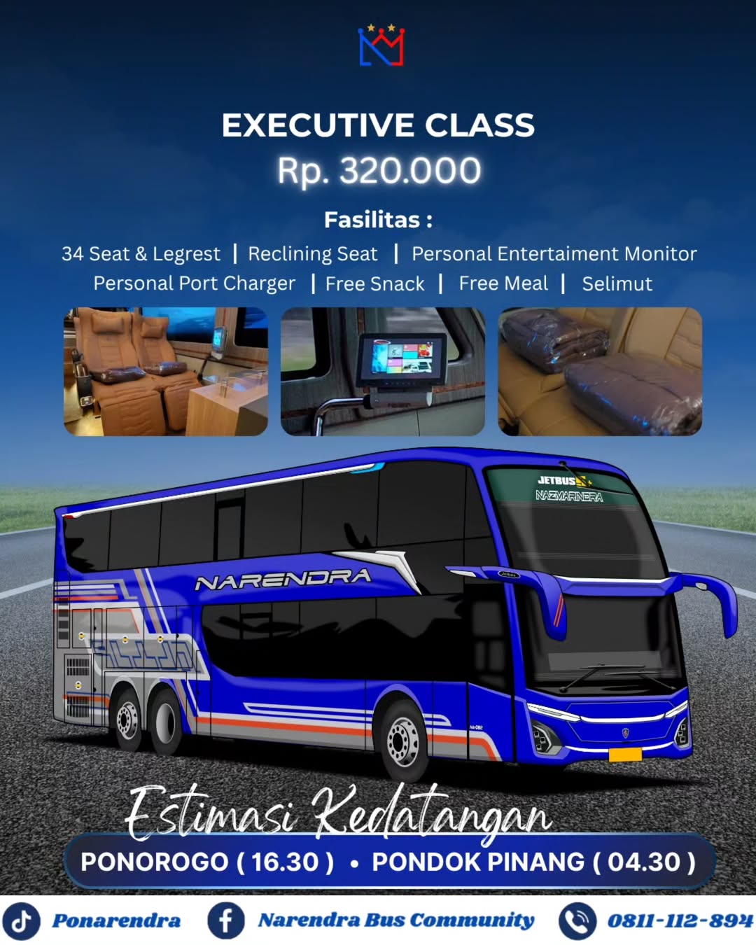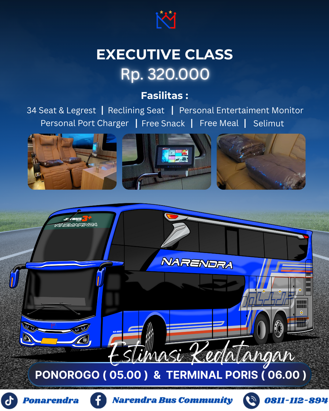NARENDRA adalah Perusahaan Otobus (PO) di bawah naungan PT Narendra Trans Tungga Putra. Kami mulai beroperasi sejak tahun 2023, NARENDRA hadir sebagai solusi transportasi AKAP (Antar Kota Antar Provinsi) di jalur Tangerang - Ponorogo yang mengedepankan ketepatan waktu, kenyamanan, dan pelayanan terbaik dikelasnya. Dengan armada bus premium double decker dan beragam fasilitas lengkap, kami menghadirkan pengalaman perjalanan yang nyaman serta membuat perjalanan anda semakin menyenangkan.